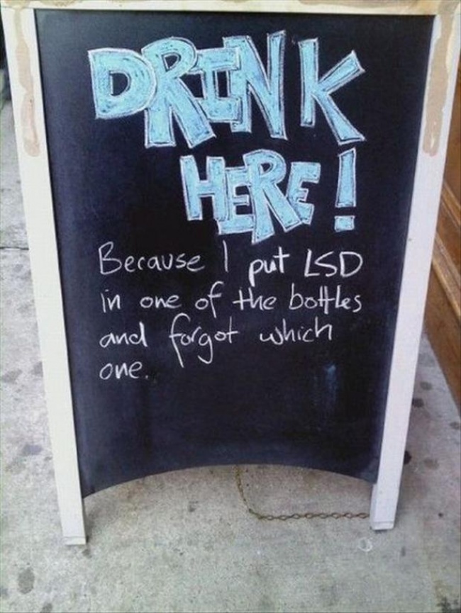 ВЫПИВАЙТЕ ЗДЕСЬ! Потому что я положил ЛСД в одну из бутылок, и забыл в какую именно.